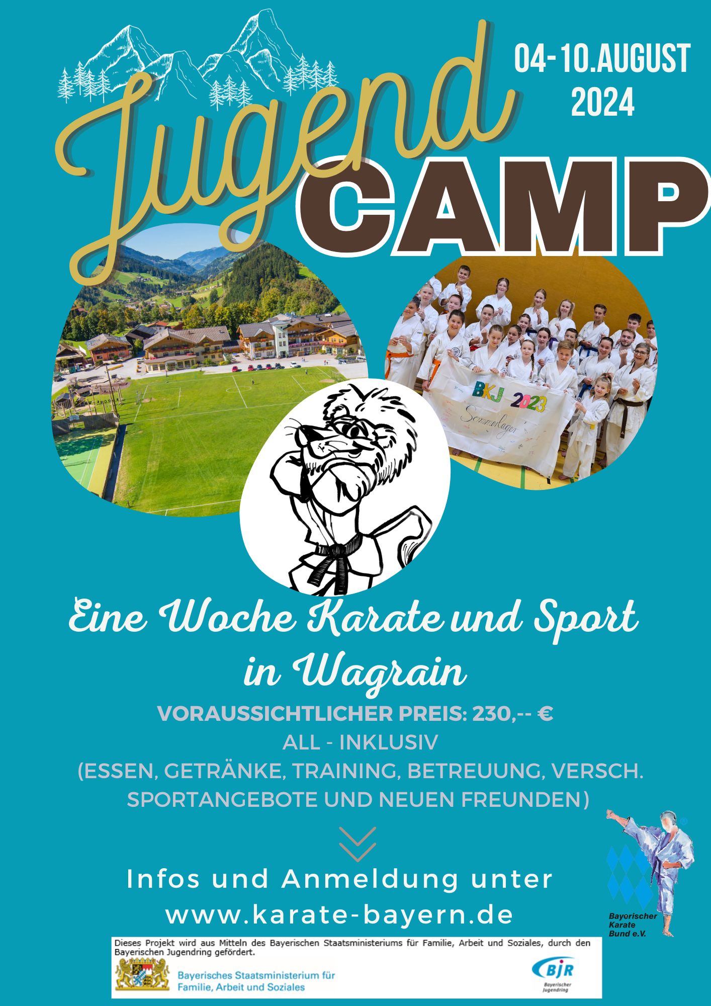 Das Karate-Sommerlager der Bayerischen Karate Jugend im BKB e.V. ist über die Jahre zu einem echten Renner in der Karateszene der Kinder geworden. Im Jahr 2024 fahren wir nach Wagrain auf den Markushof der uns viele attraktiven Möglichkeiten wie Wandern, Schwimmen, Bogenschießen, Klettern, Lagerfeuer, Nachtwanderung und natürlich Karatetraining bietet.